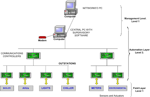 A Building Energy Management System consists of one or more self-contained computer based 'outstations' which use software to control energy consuming plant and equipment, and which can monitor and report on the plant's performance. These outstations have the ability to be linked together in a modular fashion by a network, and can communicate with each other and with an optional central operator's terminal, which is often a conventional Personal Computer (PC).
